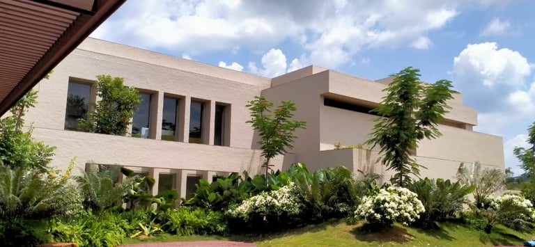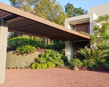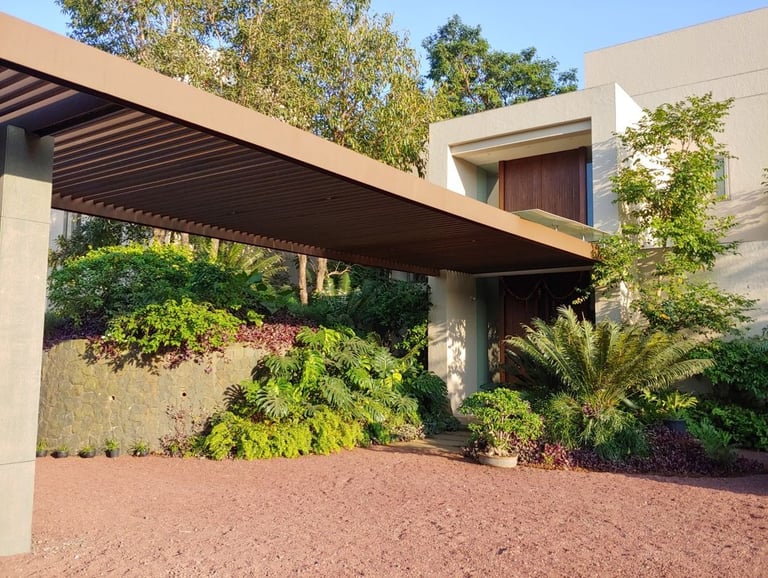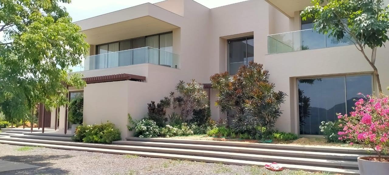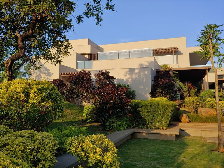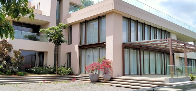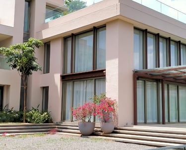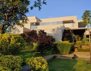Set amidst the serene contours of Aamby Valley Hills, this 20,000 sq. ft. residence unfolds along a linear expanse overlooking the valley. While one-third of the structure rests on natural ground, the remaining portion is elevated on robust columns rising nearly 50 feet above the terrain, giving the home a striking yet harmonious presence.
