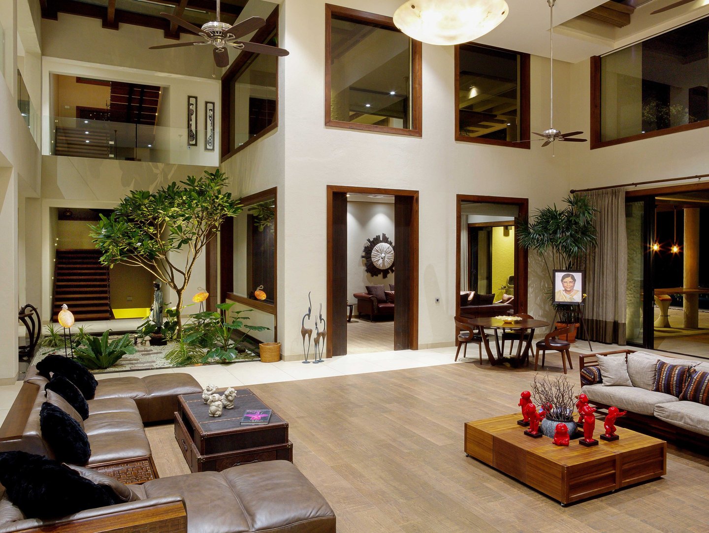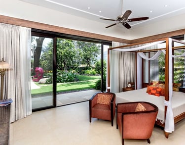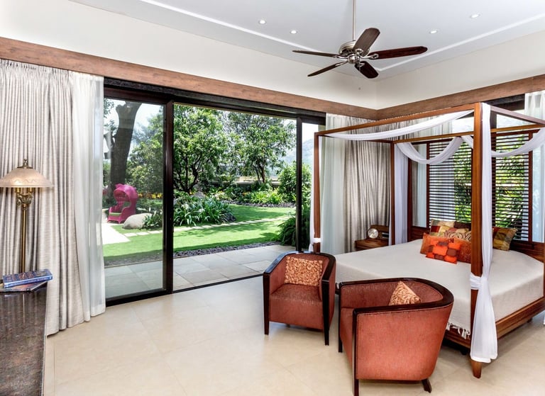 The interiors are defined by their balance of comfort and elegance — wooden ceilings, natural textures, and soft tones create a timeless ambience. The furniture and finishes are thoughtfully curated, combining leather, wood, and fabric in perfect harmony. Expansive openings blur the boundary between the indoors and the lush landscaped outdoors, allowing natural light to animate the spaces throughout the day.