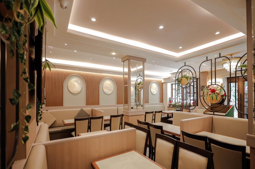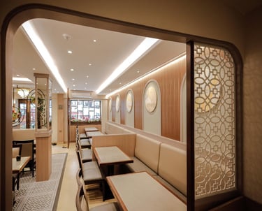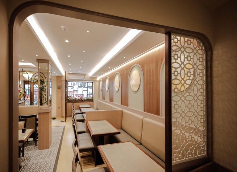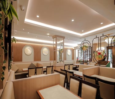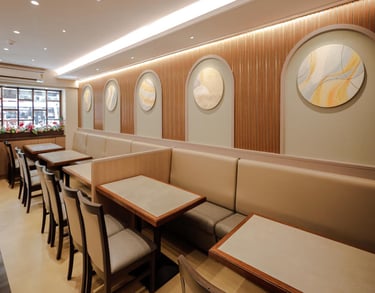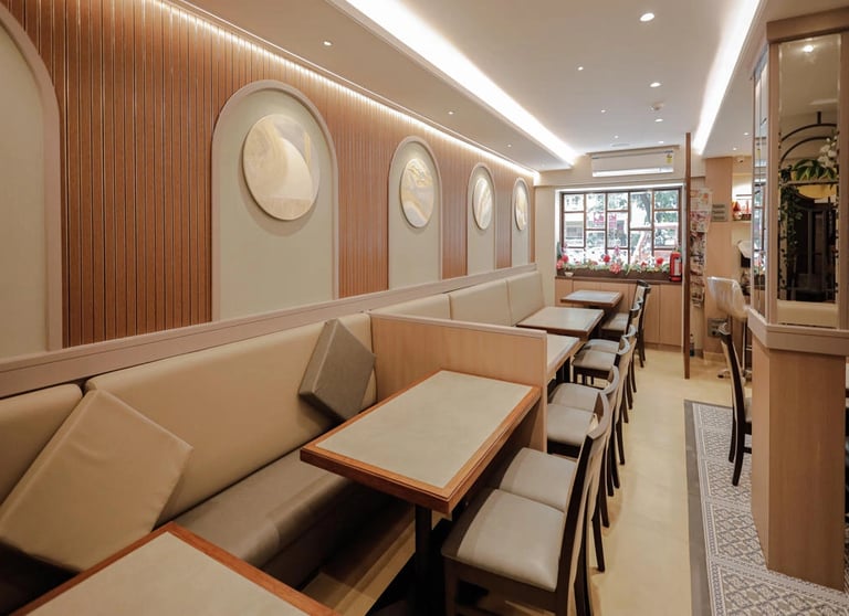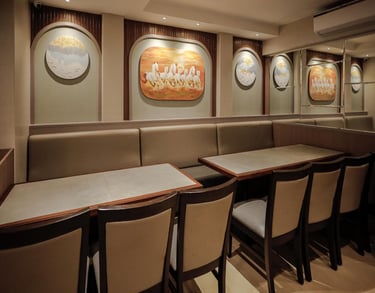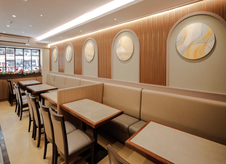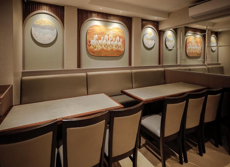 Nestled in the heart of Dadar, this exquisite fine dining restaurant offers a serene escape for vegetarians seeking a memorable culinary experience. With a soothing beige color palette that envelops the space, the restaurant creates an inviting atmosphere enhanced by carefully designed lighting that dramatically influences the mood of its patrons. The striking glass columns add an elegant touch, reflecting light in captivating patterns and providing a unique visual dimension. With a seating capacity of 80, guests can enjoy an intimate dining experience while indulging in a meticulously crafted vegetarian menu. As the second location of this successful franchise, the restaurant seamlessly combines sophistication and comfort, making it a perfect destination for special occasions or a night out with loved ones.
