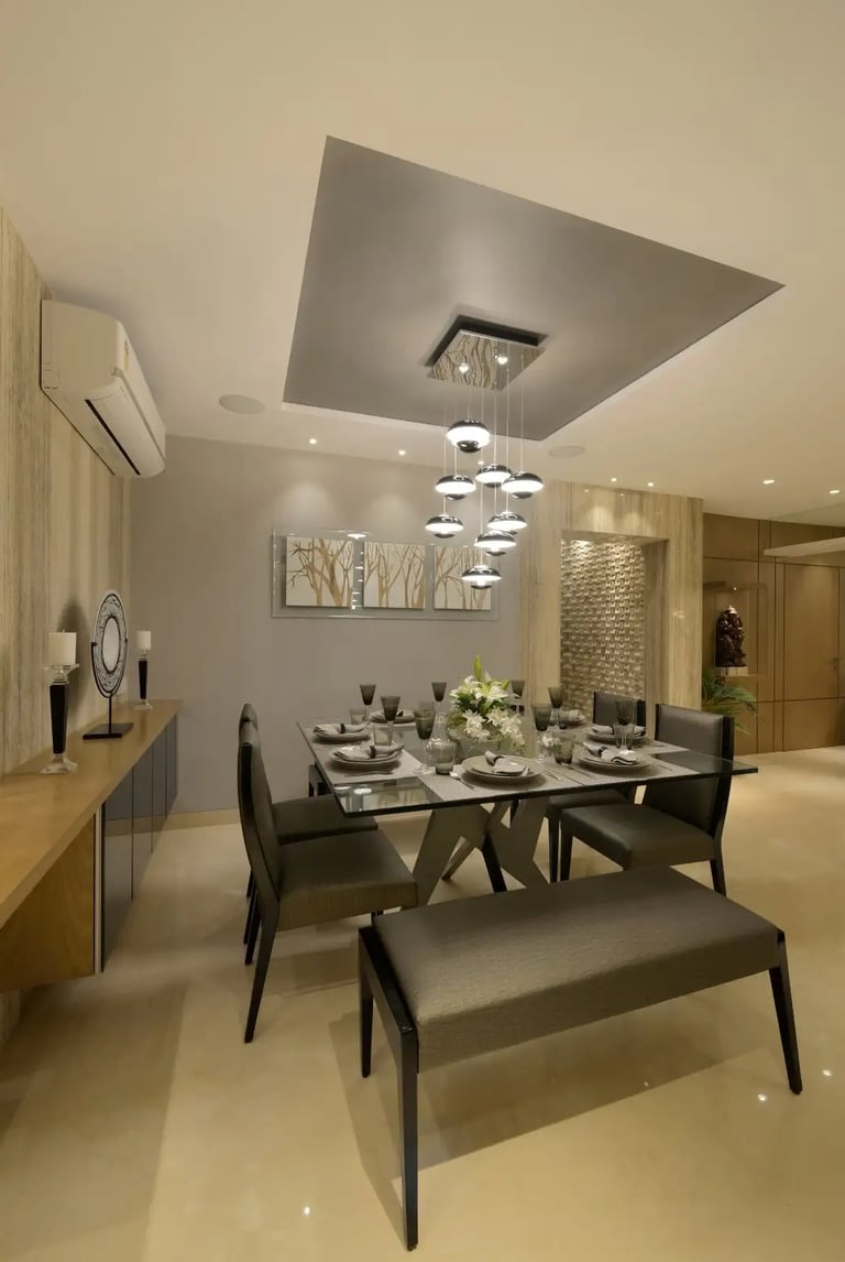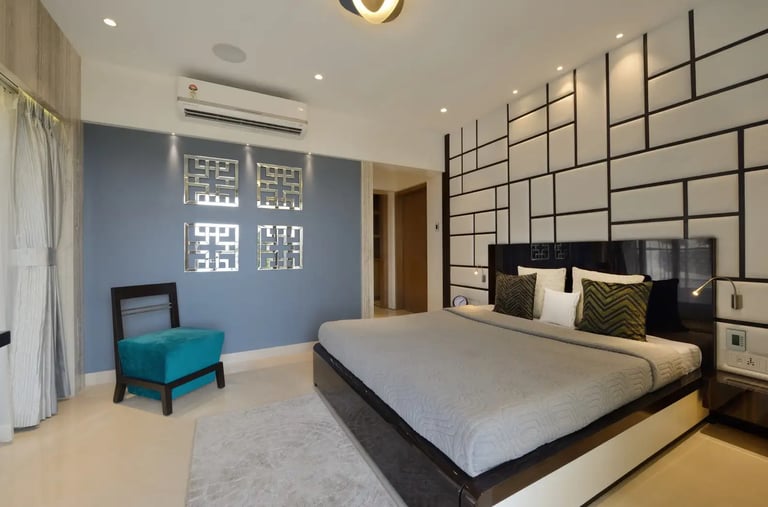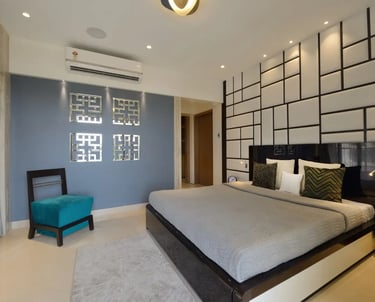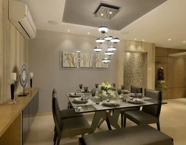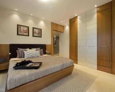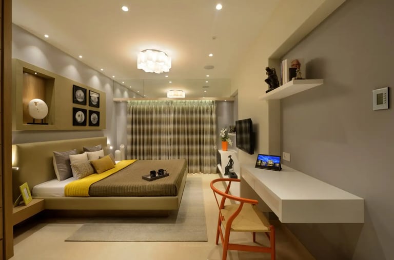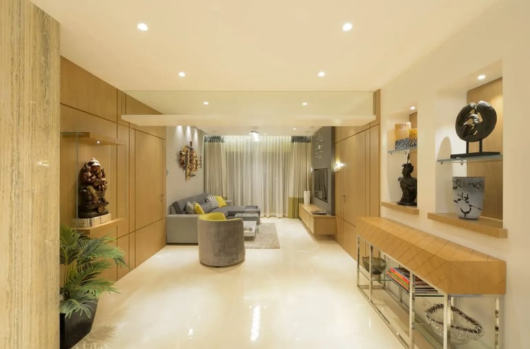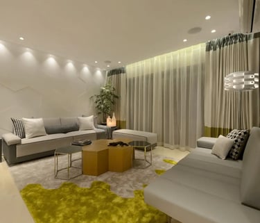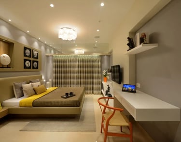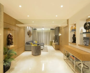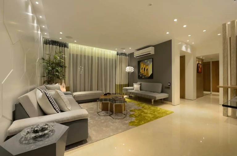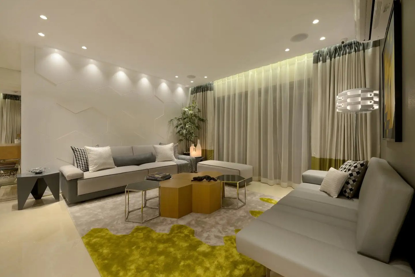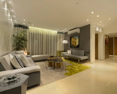 This 2,500 sq. ft. show flat, designed for a private developer, showcases a refined and contemporary interior concept. The space is defined by a subtle beige and grey palette that creates a soothing backdrop, while accents of fluorescent yellow add a touch of vibrancy and visual interest.