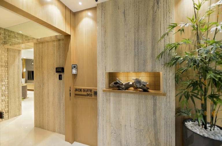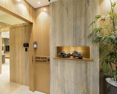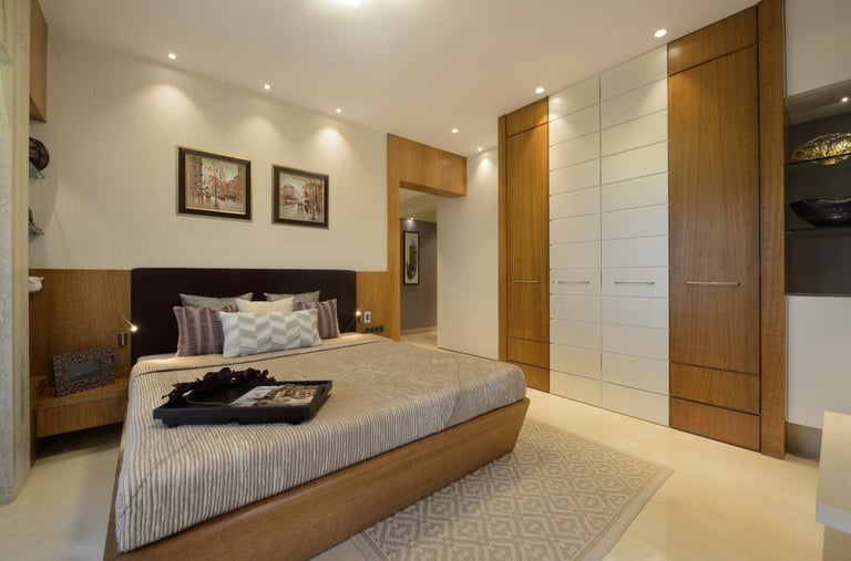 Wooden finishes seamlessly integrate across furniture and wall treatments, lending the interiors a sense of continuity and warmth. The neutral tones paired with modern textures and contemporary décor pieces give the space a balanced aesthetic — elegant yet inviting.