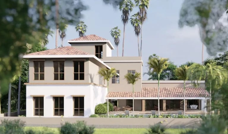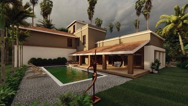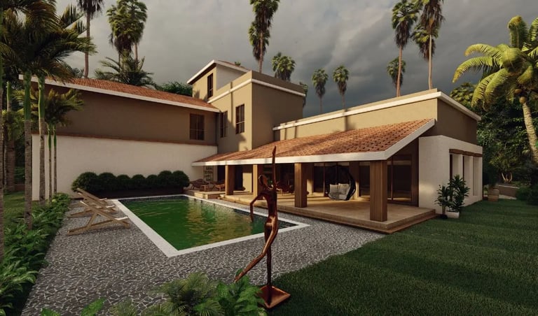 Nestled in the serene landscapes of Goa, this high-end bungalow exudes elegance and sophistication, perfect for an elite family seeking tranquility. The architectural design features charming sloping roofs that enhance its aesthetic appeal while providing a vernacular touch. As you approach the entrance porch, the inviting ambiance welcomes you into a spacious ground plus one structure that seamlessly combines modern luxury with traditional influences. At the rear, a beautifully designed swimming pool offers a private oasis, ideal for leisurely afternoons and gatherings with family and friends. This exquisite retreat not only prioritizes comfort and style but also ensures a peaceful escape from the bustling world outside, making it the perfect sanctuary for relaxation and rejuvenation.