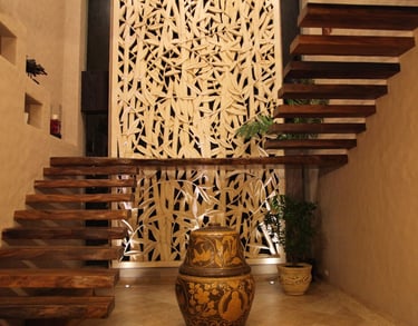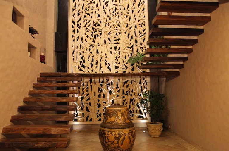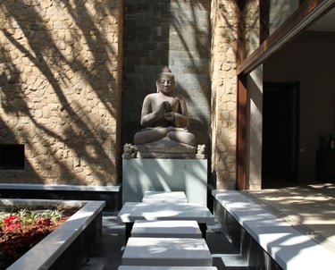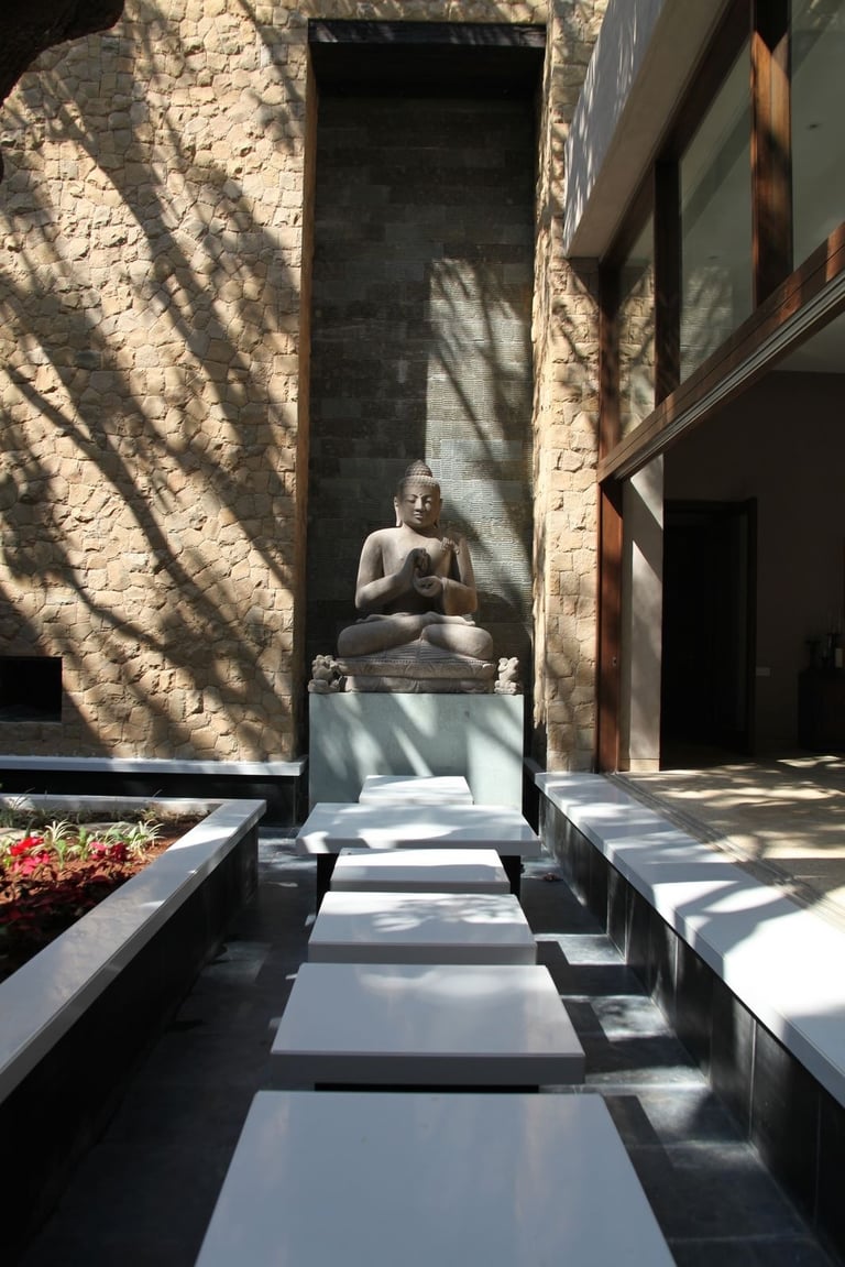 Inside, the aesthetic continues with minimalist interiors and warm natural finishes. A wooden staircase without railings becomes a striking sculptural feature, enhancing the home’s modern yet organic feel. Thoughtful details such as a Buddha statue placed in a meditative corner and lush potted greens add to the spiritual calm of the space.