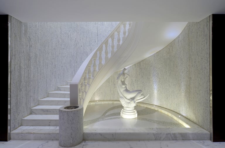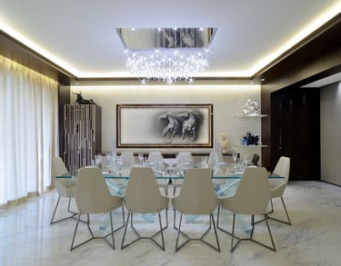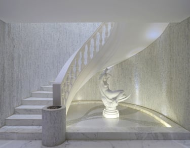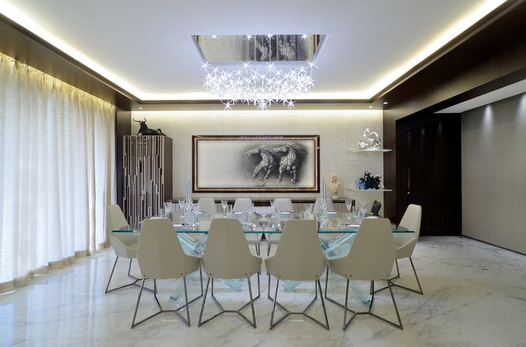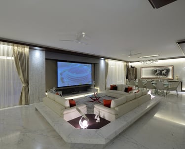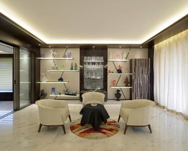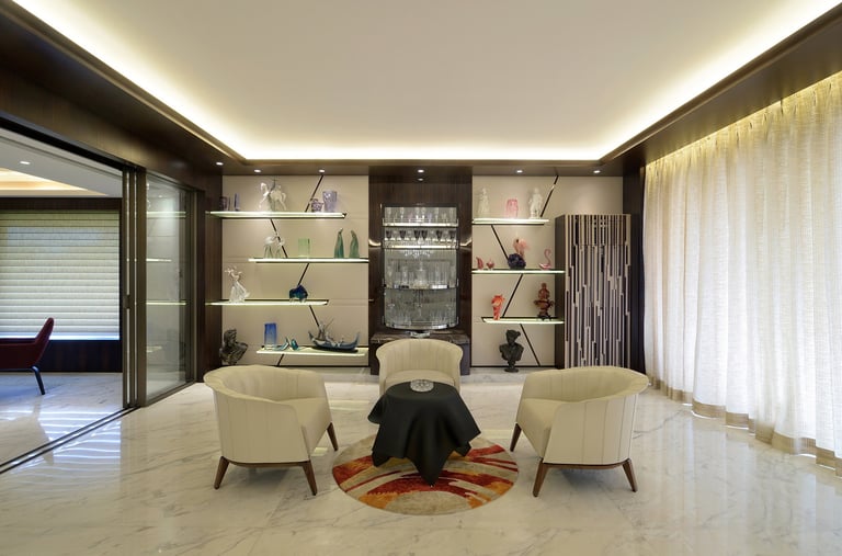 The interiors are defined by a serene white palette that enhances the sense of openness and light. Polished marble floors, soft neutral furnishings, and warm wooden accents create a soothing yet sophisticated environment. Subtle lighting, curated artworks, and thoughtfully designed display niches add layers of character to the space without overwhelming its calm ambience.