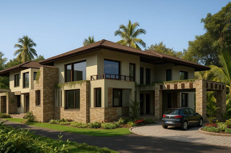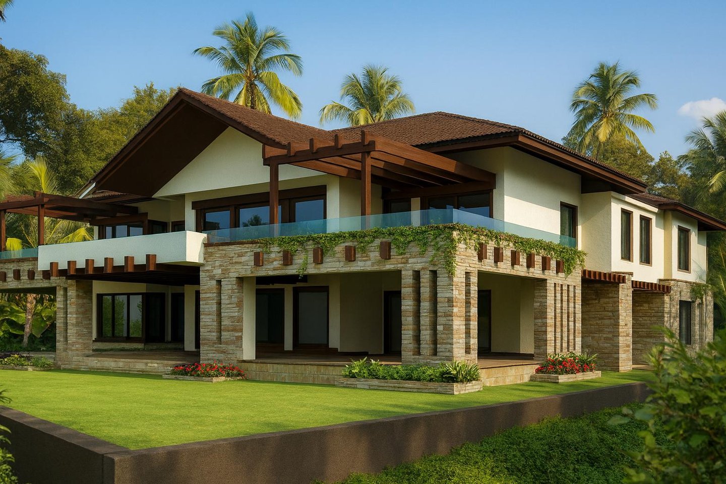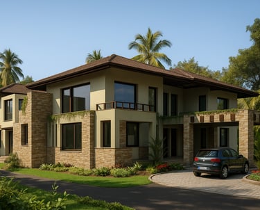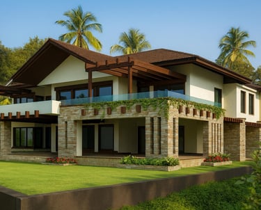 This elegant 22,000 sq. ft. beachfront villa in Alibaug is designed for a prominent business professional who desired a serene yet luxurious coastal retreat. The architecture embraces the natural beauty of its seaside setting — high ceilings, sloping roofs, and expansive terraces open directly toward the beach, allowing the interiors to blend seamlessly with the horizon. The structure combines warm natural stone, textured wood, and subtle plaster finishes, creating a timeless balance of sophistication and comfort. Lush greens, pergolas, and open decks complete the tranquil tropical experience.